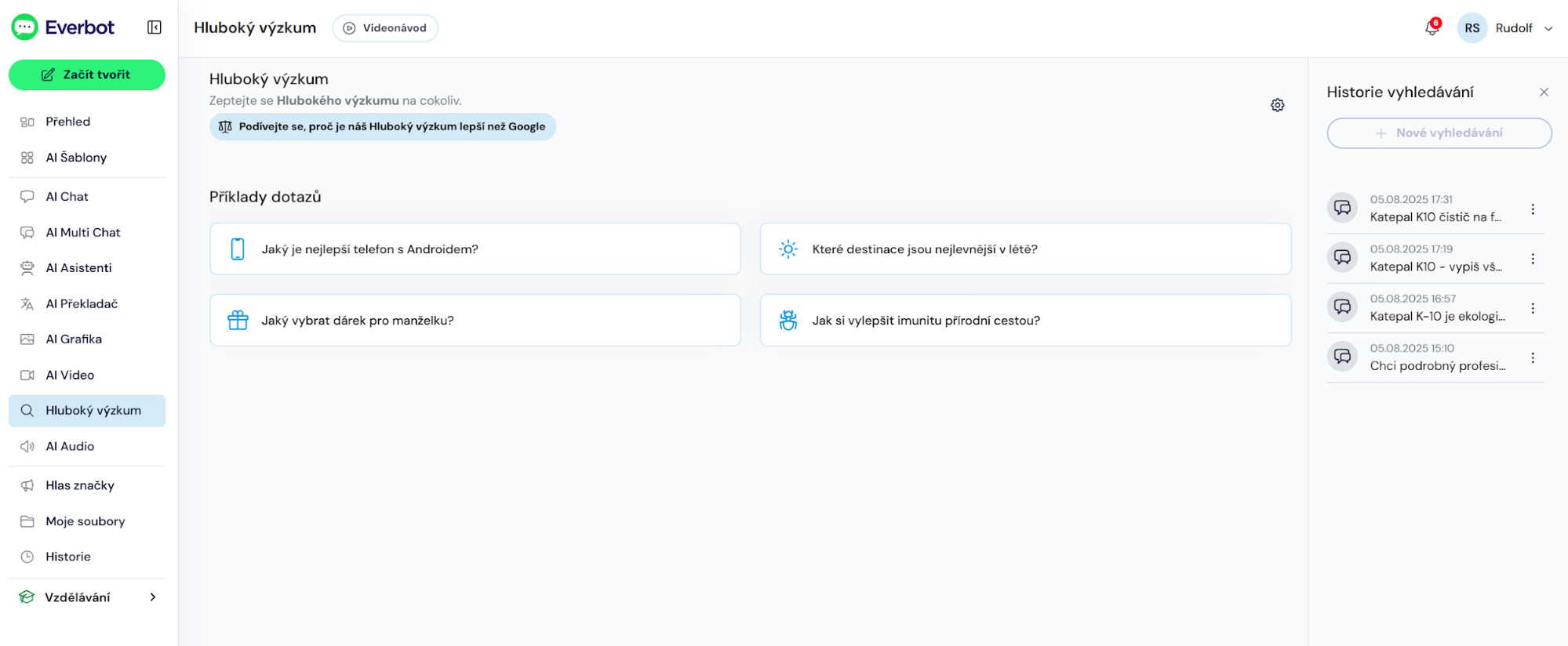 Změna sekce AI Vyhledávač na Hluboký výzkum znamená výrazný posun v tom, jak lze v Everbotu pracovat s informacemi. Namísto rychlých odpovědí přináší systém skutečné pochopení tématu, podložené fakty a důvěryhodnými zdroji. Díky Perplexity Deep Research se z Everbotu stává nástroj, který pomáhá tvořit, rozhodovat a plánovat s jistotou, že výstupy mají pevný základ.