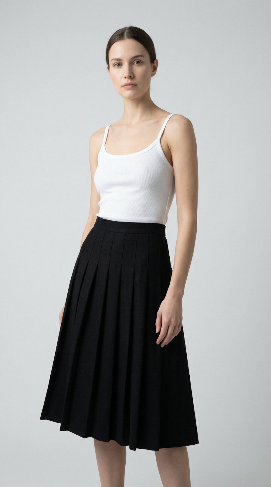 Vytvoř realistickou profesionální modelku, celá postava v poměru 9:16, stojící v elegantní přirozené póze, neutrální výraz, studio pozadí, měkké světlo, oblečená do jednoduchého bílého tílka na tenkých ramínkách a černé elegantní sukně po kolena, čistý módní styl, vysoká kvalita, ostré detaily, realistická textura látek.