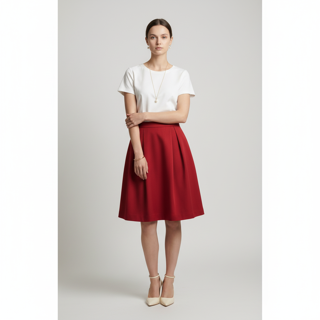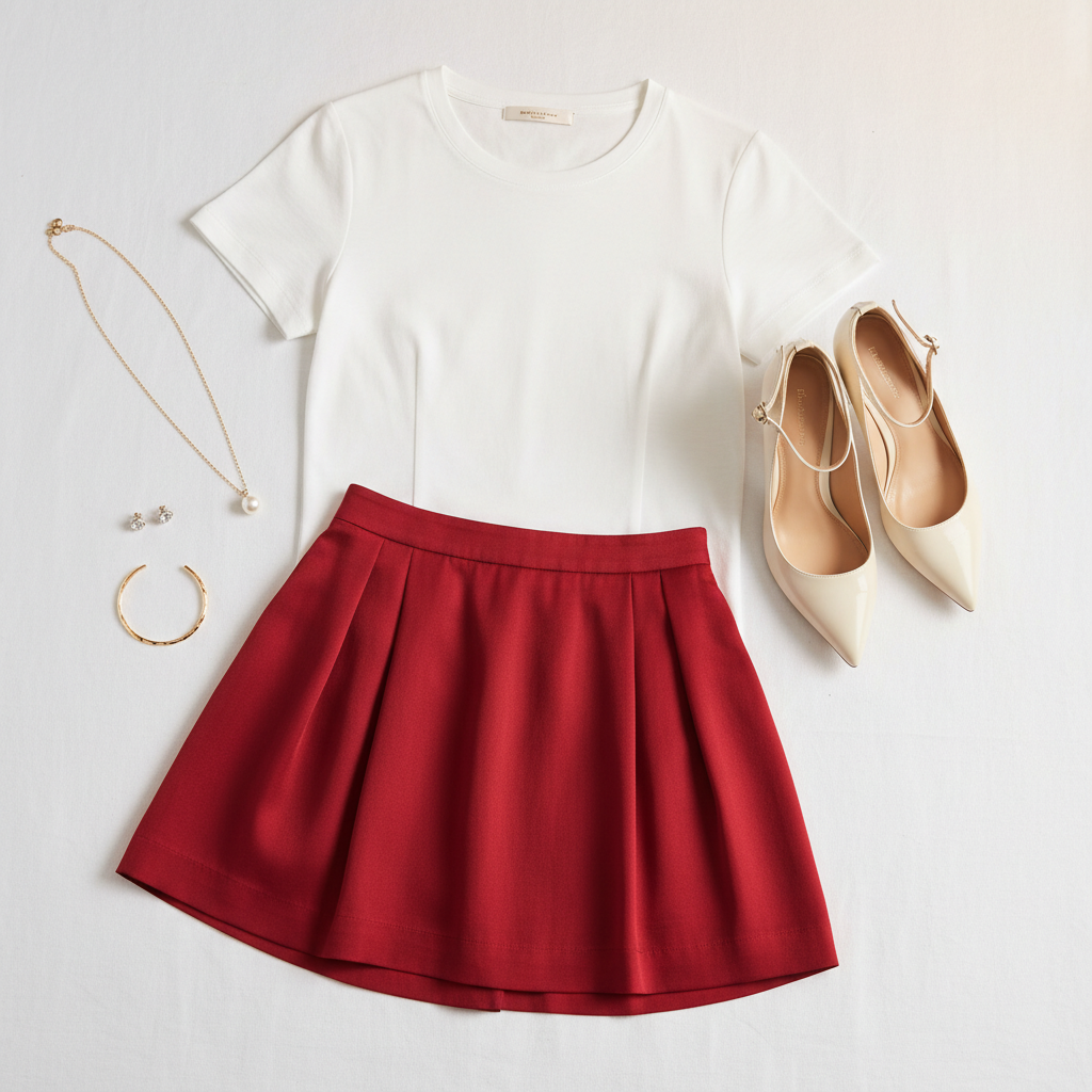 Vytvoř samostatný produktový obrázek elegantní červené krátké sukně, k ní ladícího stylového bílého trička, elegantních bot a jemných doplňků, bez postavy, na čistém neutrálním pozadí, rovnoměrné studiové světlo, módní katalogový styl, realistické materiály, vysoká ostrost. Oblečení přirozeně leží na bílém podkladu. Záběr z vrchu.