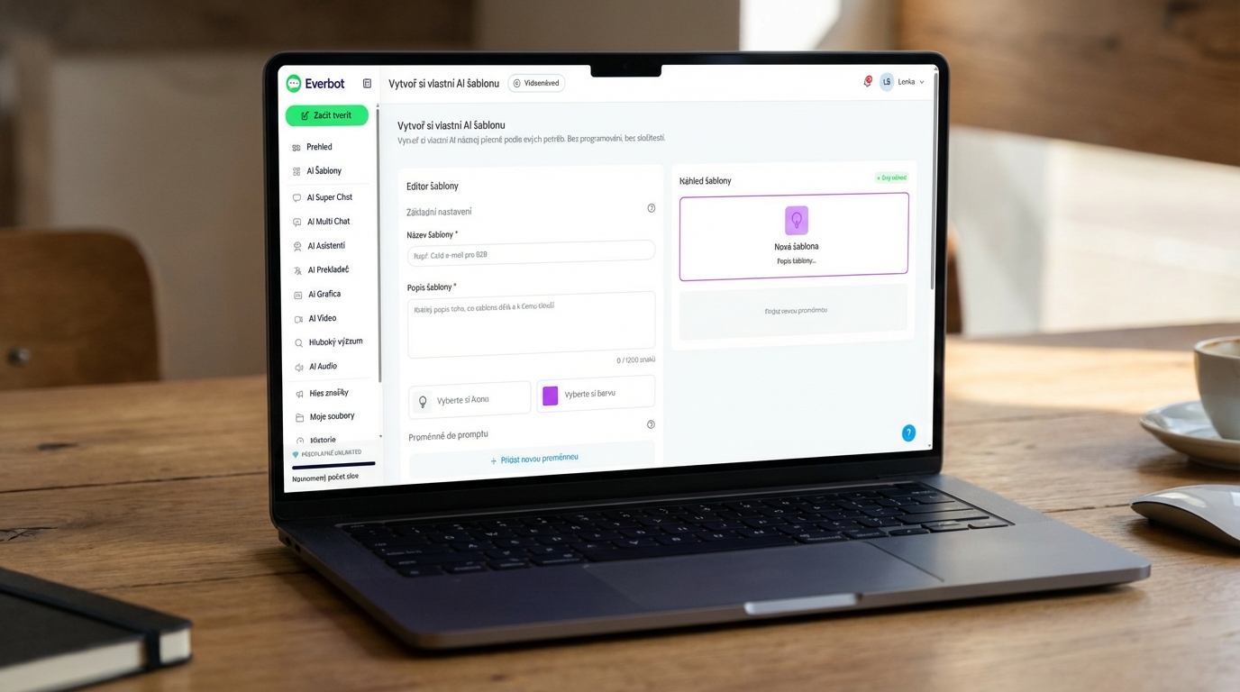 Poslední velkou únorovou novinkou je možnost vytvářet si vlastní AI šablony pro opakující se úkoly. V přehledném editoru si bez programování postavíte nástroj, který přesně odpovídá vašim firemním procesům a stylu komunikace. Můžete definovat různé typy proměnných, jako je krátký text pro jméno klienta, výběr z možností pro cílovou skupinu nebo číselné hodnoty pro délku textu.